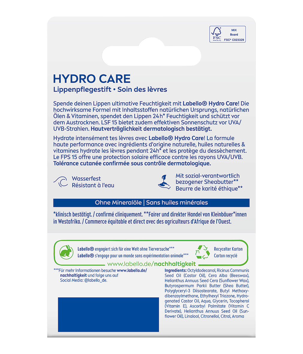 Unterstütze die natürliche Feuchtigkeitsbalance deiner Lippen mit Labello Hydro Care. Die Formel mit Sheabutter und natürlichen Ölen pflegt deine Lippen 24 Stunden lang und schützt sie vor dem Austrocknen - ohne Mineralöle. Mit LSF 15 ausgestattet, bietet Labello Hydro Care zusätzlichen Schutz vor schädlichen Sonnenstrahlen. Erlebe mit Labello Hydro Care langanhaltende Feuchtigkeitspflege für weiche, gesund aussehende Lippen – jeden Tag, überall.