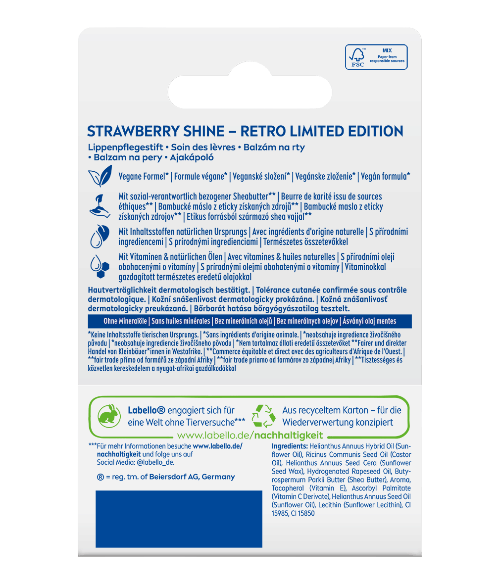 Der Labello Strawberry Shine vereint intensive Pflege mit einem Hauch von zartem Glanz und dem fruchtigen Aroma von frischen Erdbeeren für unwiderstehliche schöne und gepflegte Lippen. Verwöhne deine Lippen mit dem Labello Strawberry Shine je nach Bedarf. Die vegane Formel mit natürlichen Ölen und Erdbeeraroma spendet dir 24 Stunden lang Pflege und schützt deine Lippen vor dem Austrocknen und das ganz ohne Mineralöle. Der Lippenpflegestift verleiht deinen Lippen ein zartes Finish und umhüllt sie mit dem aufregenden Duft von Erdbeeren. Die Lippenpflege ist rückfettend und versorgt die Lippen mit wertvollem Vitamin E, Sonnenblumenöl sowie reichhaltiger Sheabutter für frisch aussehende und spürbar gepflegte Lippen und das den ganzen Tag. Entdecke die verlockende Kombination aus Pflege und verführerischem Duft für ein unvergleichliches Lippenverwöhnprogramm.