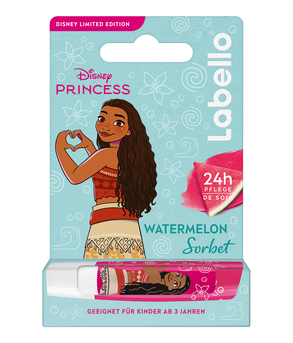 Verwöhne deine Lippen mit Labello Watermelon Sorbet der Limited Disney Princess Edition. Die Formel mit natürlichen Ölen und Wassermelonenaroma spendet 24h Pflege und schützt sie vor dem Austrocknen - ganz ohne Mineralöle. Der Lippenpflegestift verleiht deinen Lippen ein zartpinkes Finish und umhüllt sie mit dem aufregenden Duft von Wassermelone. Für frisch aussehende und spürbar gepflegte Lippen - den ganzen Tag.